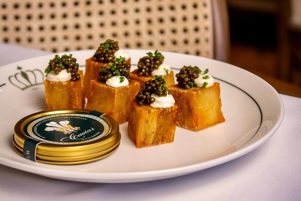 Caviar is a theatrical experience at this St James restaurant, where no trip is complete with a visit from their caviar trolley. There are three options, all priced by the gram with a minimum order of 10g. Make your choice and it'll be measured out tableside along with blinis, baked new potatoes, and scrambled eggs made tableside. If you're looking for something a little simpler, the salt and vinegar crispy potatoes with caviar on the bar menu are excellent.