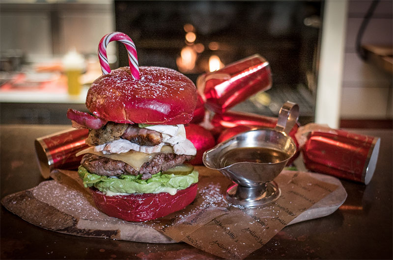 And finally, they'll have a Christmas burger, of course. That'll be a patty topped with roast turkey, bacon, pigs in blankets, stuffing, sliced brussels sprouts and brie, and cranberry sauce. It'll be served in one of those red buns and held together with a candy cane, before being served with a side of gravy dip. So that's your Christmas dinner AND dessert all in one burger.