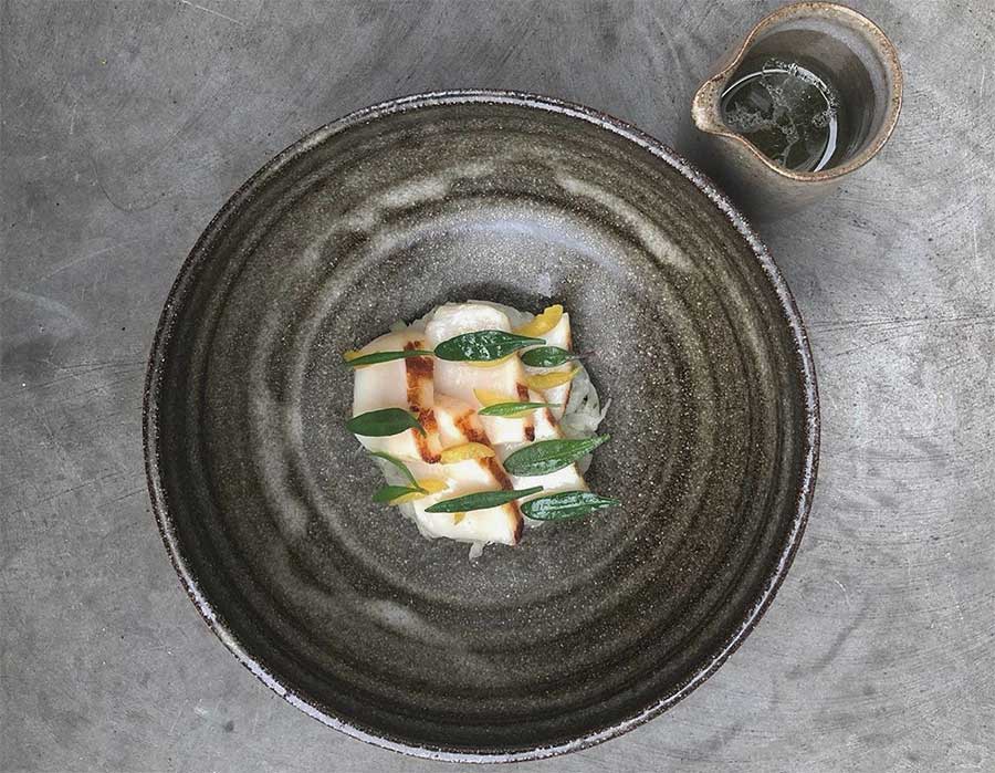 - Meadowsweet with white chocolate and fig leaf oil.