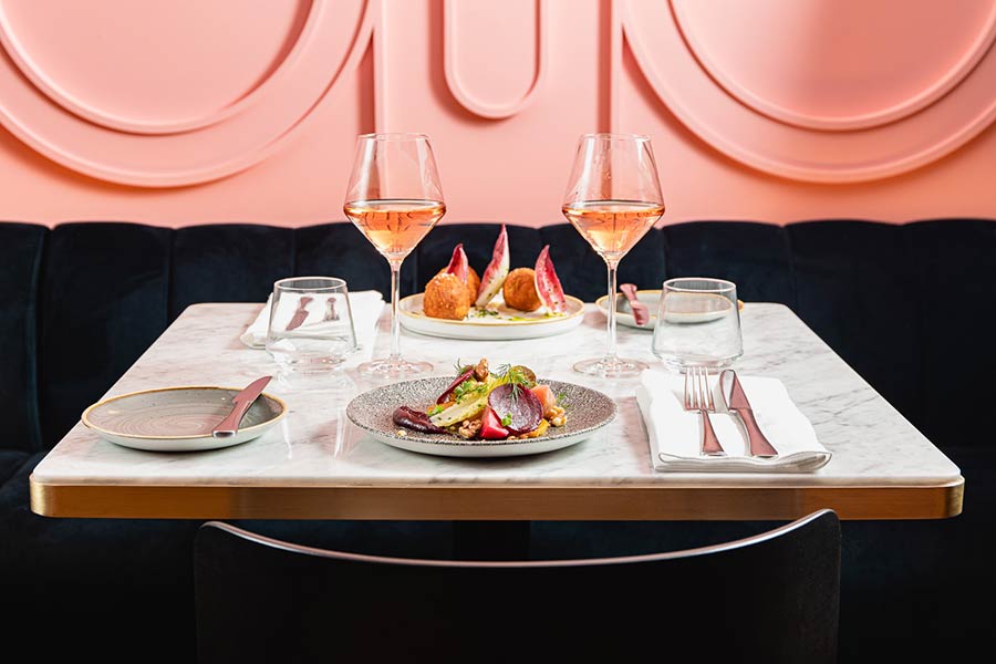 But much as we like the look of the theatre, we're here to talk about the food - as the new venue has a new art deco-style restaurant and bar, linked to the theatre by a glass, double-height bridge. There's also a full double-height window looking out onto Soho from the bar.