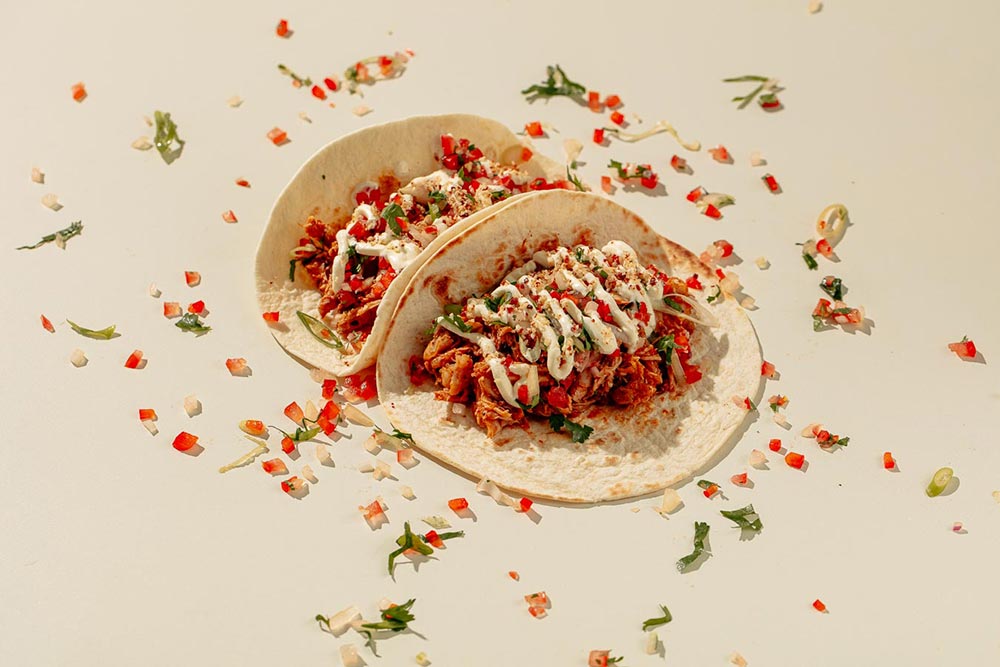 - Crunchy sourdough tortilla with melted mozzarella cheese, scrambled eggs, pico de gallo, caramelised onion, chilli jam, bacon and hash browns