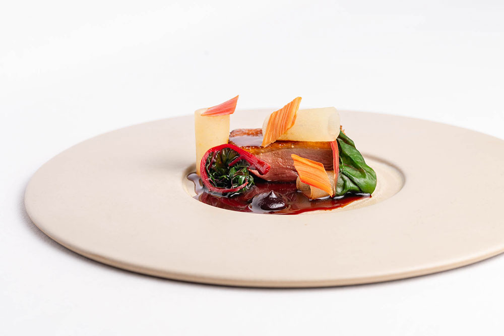 21 Day aged Duck with black olive praline, compressed Ercolini pear, and rainbow chard