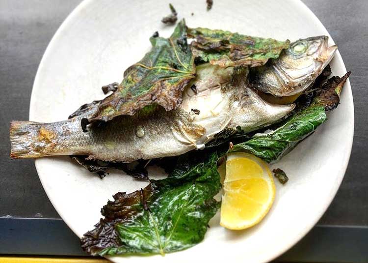 5. Sea bass, wrapped in fig leaves & stuffed with walnuts (£24)