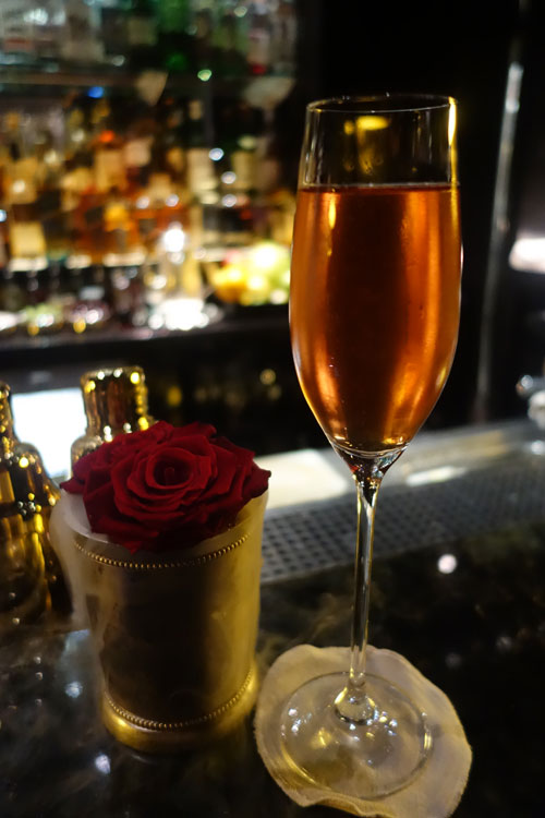 Hot Dinners popped along to try a few of the cocktails. First out was The Impressionist featuring Cherry Marnier, Creme de Violette, Raspberry Sugar topped up with Ruinart Rose Brut (£26). It was served with a pot of roses from which poured forth a torrent of rose-scented fog. VERY romantic and perfect for continuing HotDinners2's unerring ability to order the pinkest cocktail on any given drinks list.