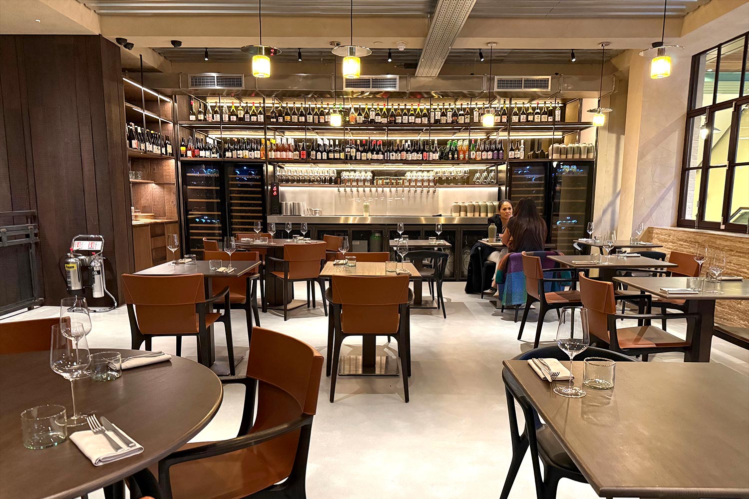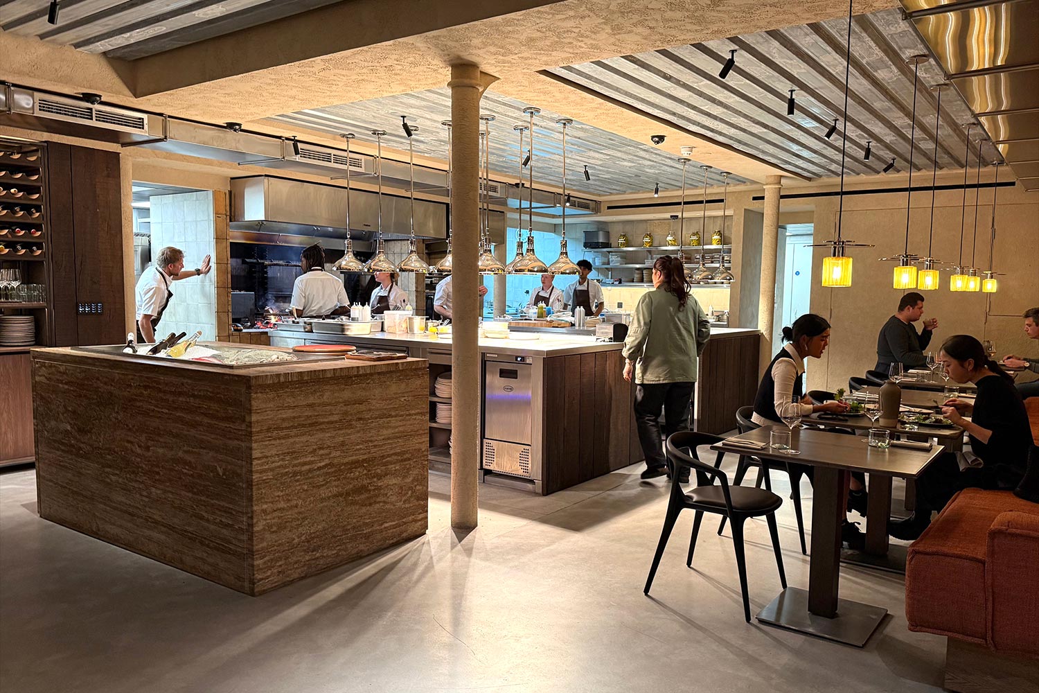 It's at the northern end of Kingly Court in Carnaby, taking up a pretty big space there on both the ground and first floor (it may well be the biggest site in the court). The whole building has been given a stripped-back look, and on the ground floor, you'll find the striking open kitchen. This is probably one of the best places to sit, in our mind.