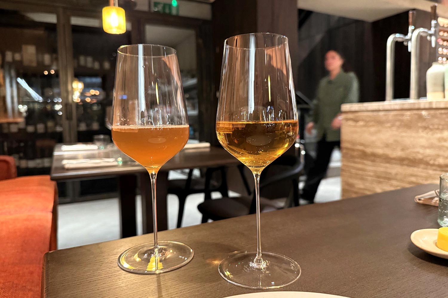 Cocktails, some served unexpectedly in wine glasses, include the Basque 75 (their version of a French 75) that features oak-aged vodka, Txakoli, verjus, orange blossom, Oloroso sherry and blanco vermouth (£14)
