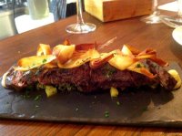 Diego oversaw our steak order, urging us to try the two cuts of skirt and flank both of which are slow cooked using the sous vide, and then finished off on the parilla. The skirt came with tiny cubed parsnips and ribbons of deep-fried parsnip crisps, the flank with pureed celeriac and bone marrow. Smile nicely at your waiter and see if they'll also give you a pot of Zoilo's fabulous chimichurry that normally accompanies the ribeye - it's worth asking for. It goes without saying that we had the famous Zoilo chips to go with these - which were utter heaven, fried to perfection and topped with social life impairing amounts of garlic and parsley.