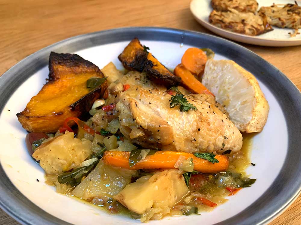 Moroccan Chicken Tagine - organic free-range chicken thighs spiced and simmered with seasonal vegetables, served with cured lemon paste (£12) - match this with their couscous (£3) which was ten times better than any couscous we've made at home.