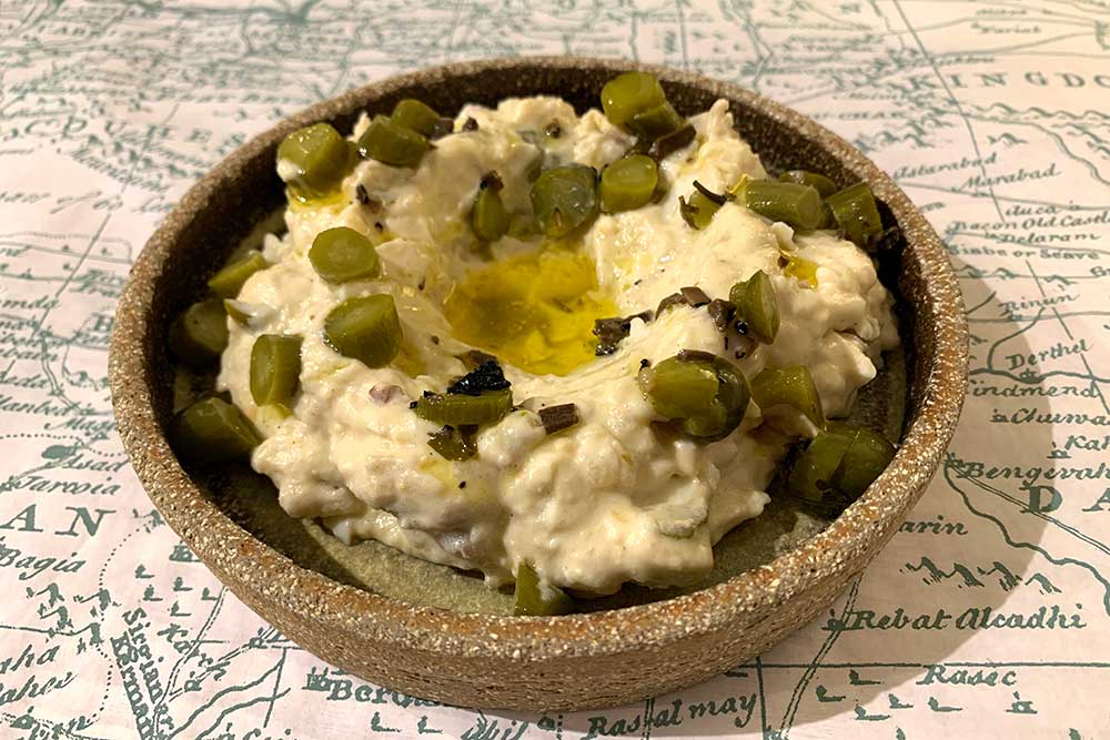 Hummus - a very silky version made with black chickpeas, tahini and scattered with walnuts and somagh. This comes in a piping bag which should let you pipe a perfect dome (we didn't quite achieve that).