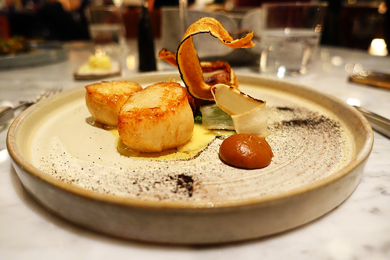 Roast diver scallops, salsify purée, mustard and beurre blanc (£16) - generously sized and perfectly cooked scallops.