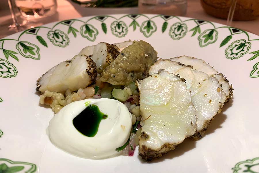 Za'atar spiced monkfish cooked over coals, fregola and smoked aubergine pesto (£31) - we weren't too inspired by this dish, and had been expecting it to be a little spicier than it turned out to be.