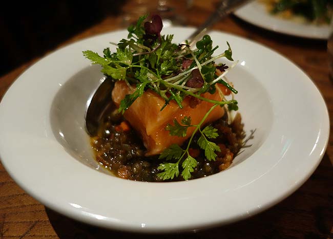 - Warm confit of salmon with duck, puy lentils and herbs (£6.75) - it's easy to please us with puy lentils but this offering paired it with some incredibly tender salmon to good effect