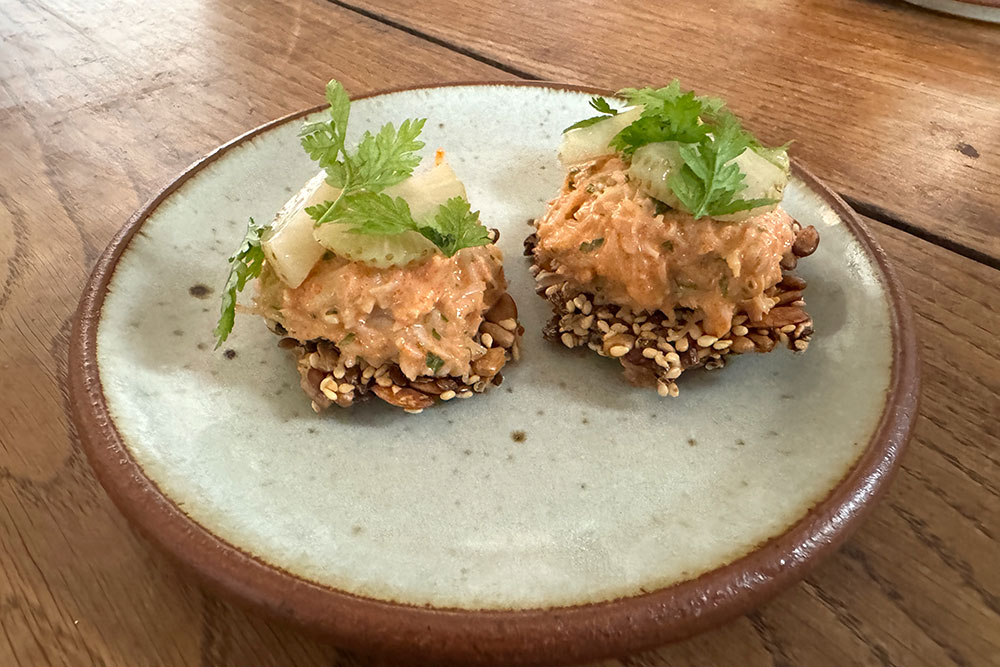 Cornish crab cracker with green strawberry (£8 each) - a fabulous snack on a homemade seedy cracker.