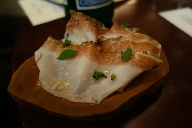 Our dinner kicks off with a few aperitivo – the best of which was the utterly moreish Lardo di colonnata with honey and maggioroma (that last one is marjoram – we had to look it up) with a heavenly sweetness which melted on the tongue . That was £3, order two if you’re piggy and don’t want to share.