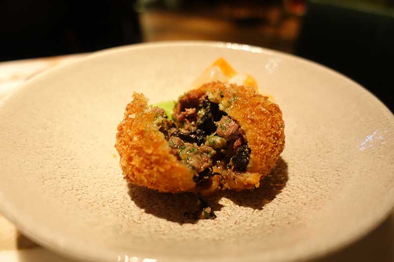 There are snacks - but they're only listed on the main menu, so make sure to ask for that if you're in the bar area (they really should add the snacks to the main drinks list too). And it's a pretty good selection - with crispy fried scampi and pigs head and black pudding croquettes on the menu. But here's what we had on the night: