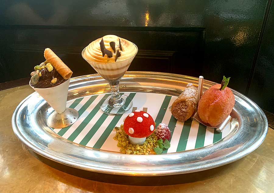 For dessert, we went a little off-piste trying out the Piccoli Dolci menu. This is Harry's Bar's afternoon tea offering - a miniaturised selection of their usual desserts. The platter includes the Toadstool you've probably seen on Instagram, made of Mascarpone cream, fresh raspberry and chocolate as well as Gelato Cannoli, Chocolate and Pistachio Sundae, Salted Caramel Tiramisu and Peach doughnut.