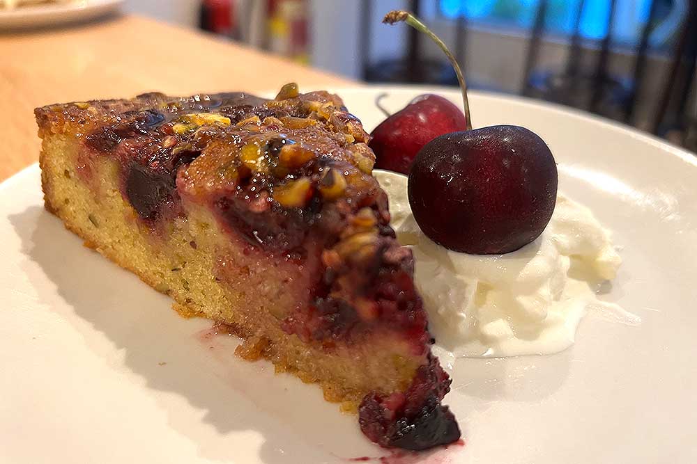Cherry & pistachio cake with sour cream - a still-warm slice of dense and delicious cake which would have been a standout in any restaurant, but just couldn't beat the cheesecake as our favourite.