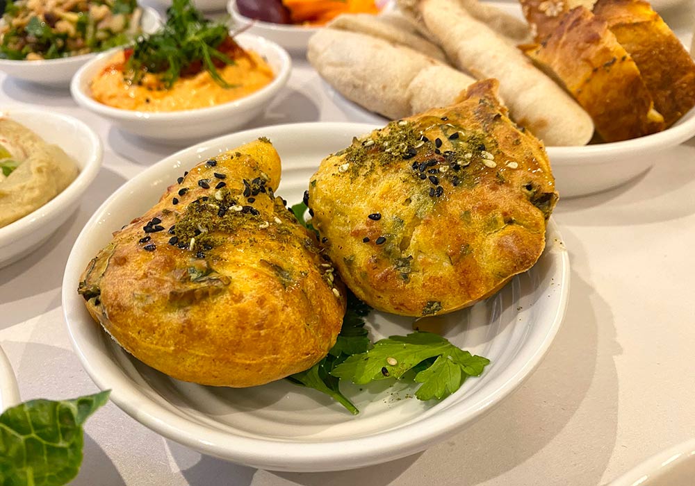 Halloumopitta - a close-up of just one of the mezze dishes, this is a Cypriot pie made with halloumi and topped with thyme honey and za’atar