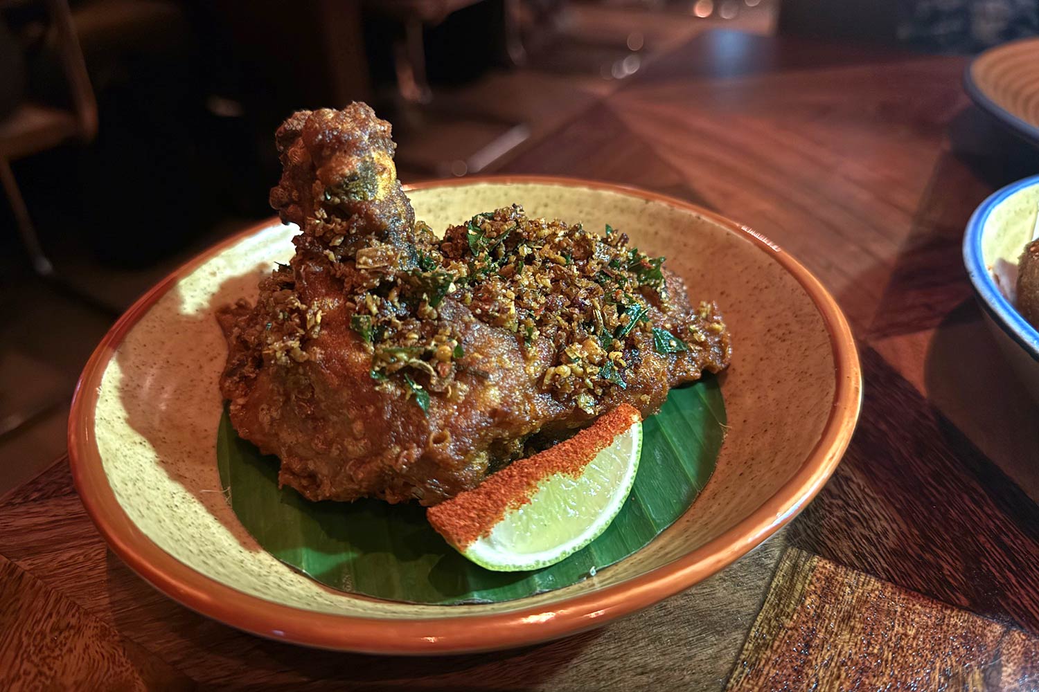 Fried chicken chop in a chilli and curry leaf crumb (£10) - Keralan-inspired, this is an extremely crunchy, spicy piece of chicken.