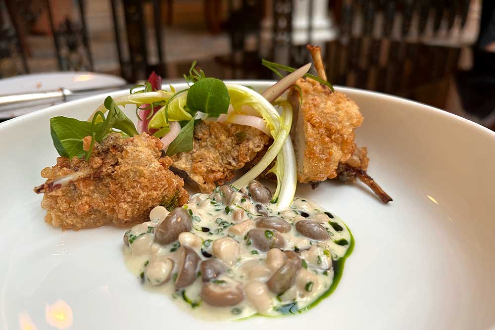 Buttermilk fried quail with mushroom, spring onion and chicken vinaigrette (£18) - perfect crispy boneless quail, a very posh take on KFC.