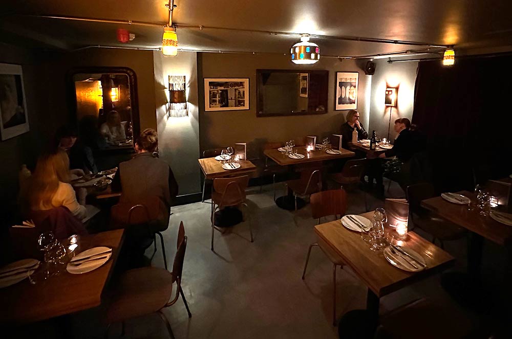 It is. The ground floor is all counter dining with seats up at the kitchen and along the windows. The sections of the counter that are divided into twos, looking out over Soho are particularly nice for couples or mates wanting to catch up. Downstairs there's a decent size dining room if you're eating here in a larger group and want to be at a table.
