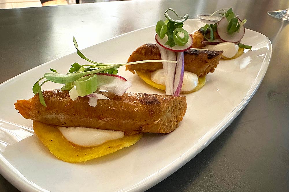 Txistorra de mar with spicy yogurt & talo (£12) - a seafood take on the traditional Basque sausage, made here with mackerel and monkfish.