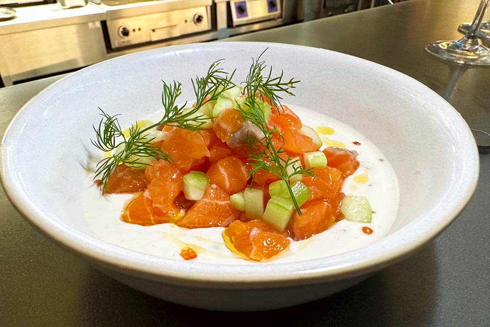 Loch Duart salmon tartare in a bowl of ajo blanco with diced cucumber (£14)