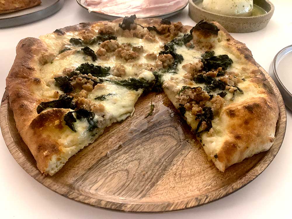 Youporn Pizza (£14) - Tuscan sausage, Sicilian fennel seeds, provola cheese, spinach, parmigiano cream. SUCH a good pizza - fantastically chewy base with loads of flavour.