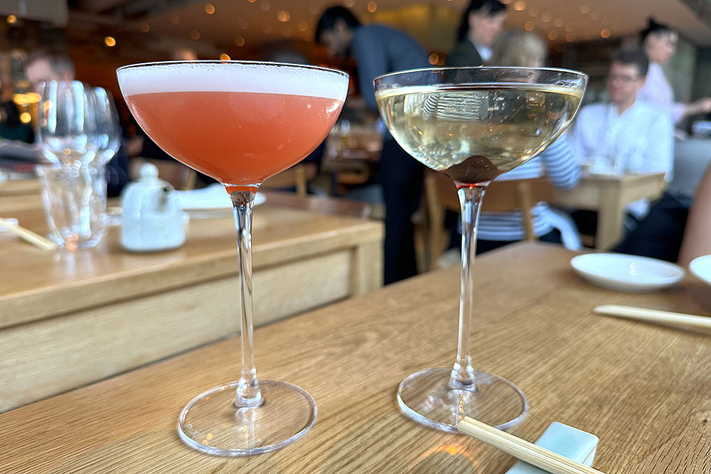 Left to right: Hiros Club (£12.40) and the very drinkable Sakura 75 (£14.10) made with Roku gin, cherry blossom, koji yuzu sake and Champagne.