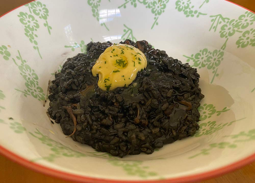 Arroz Negro - rice cooked in prawn bisque and squid ink, topped with their own aioli. Just warm up the bisque and slowly mix it into the rice on the heat. This is very satisfying to make, and works as a good side to some of the other dishes too.