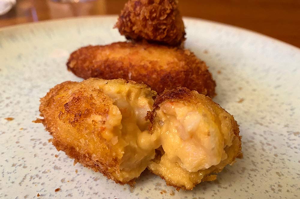 Prawn croquetas - just fry them in the (supplied) oil for a couple of minutes - they retain all the very important gooeyness on the inside.