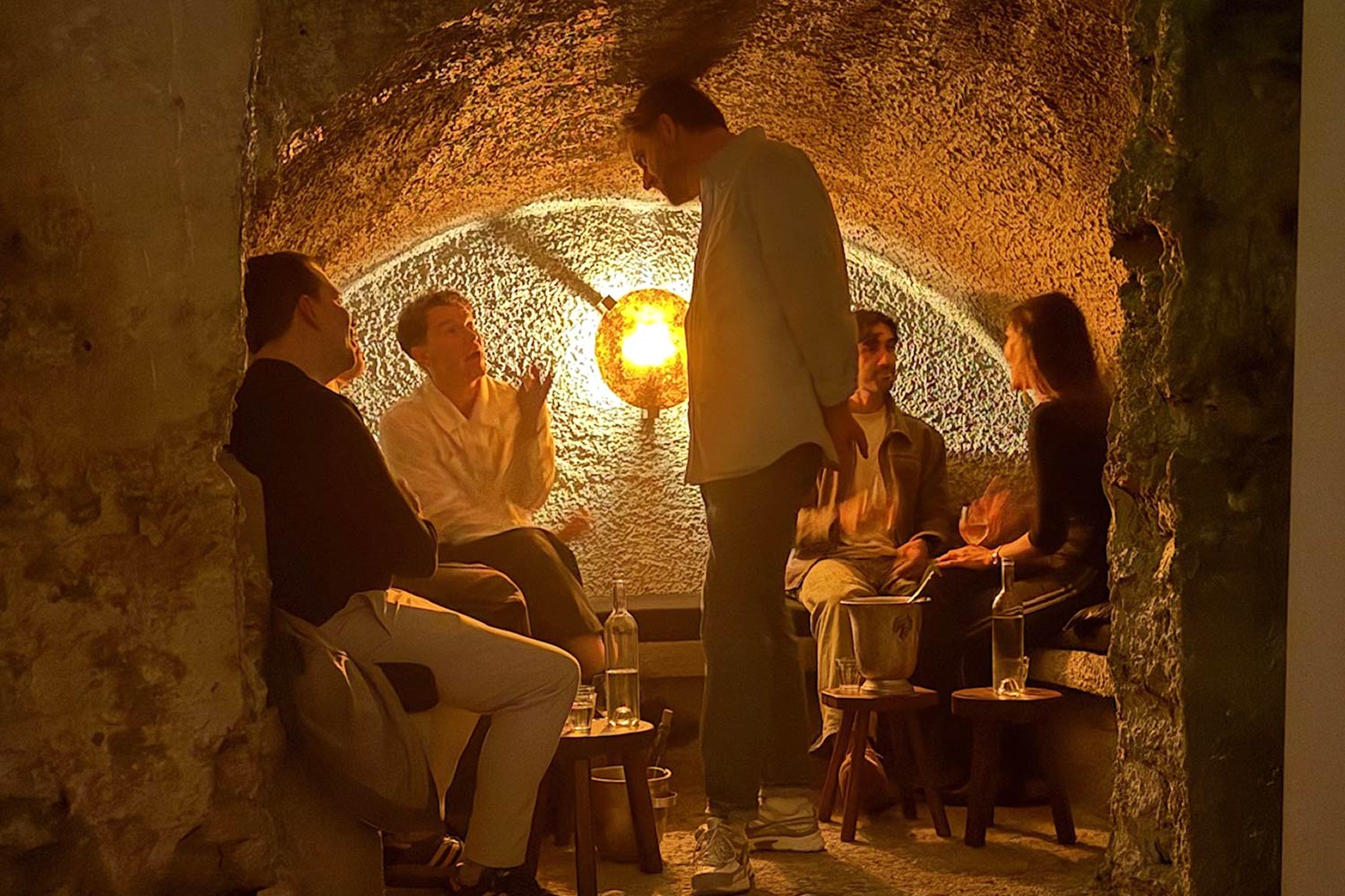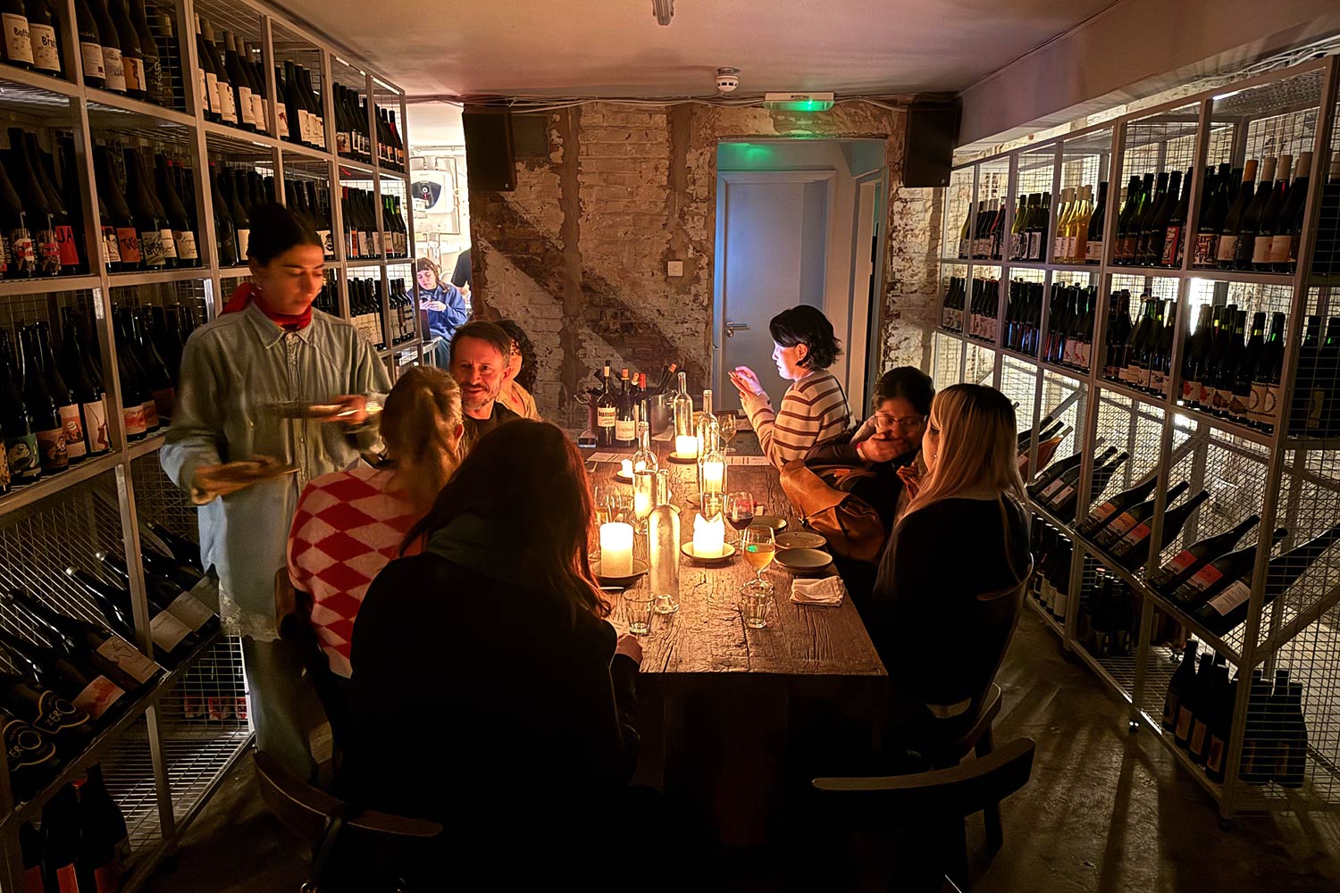 There are three distinct areas down here. The main room is filled with a communal table. Off to the left, there's a round wine room with a circular table, then there's a longish corridor with three bookable private areas, and a space that's perfect for just perching and drinking.