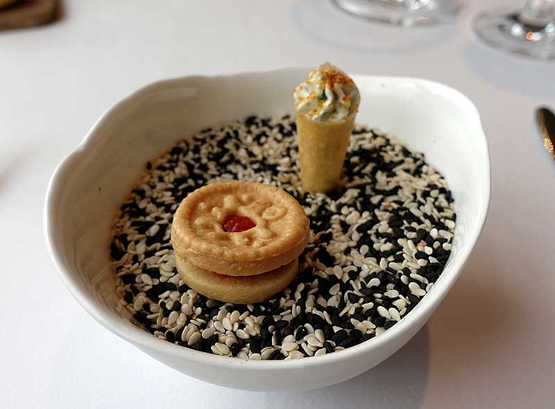 The tasting menu comes in at 7 courses for £70 - with a few extras thrown in. The menu doesn't give much away in terms of what to expect. But the canapes give you an idea of the fun you're about to have. What looks to be a teeny jammy dodger and ice-cream cone turn out to be a shortbread and tomato and pepper jam biscuit and a brik cornet with whipped cream cheese in it (the jammy dodger is a dish that Murphy has taken with him from The Woodford).