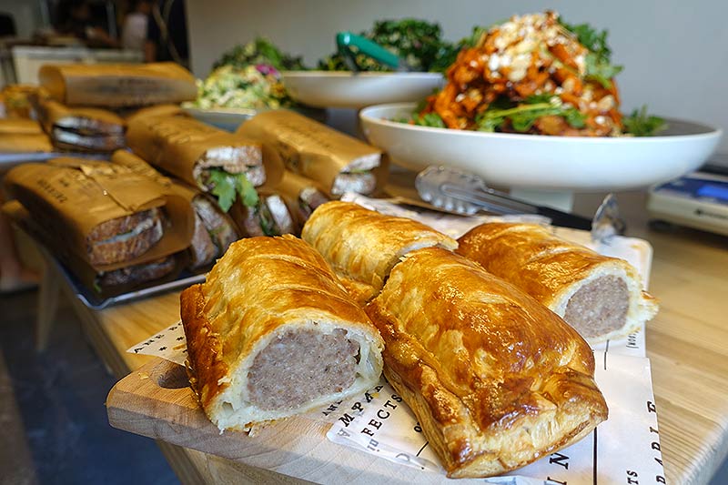 A mix of salads, sandwiches, pastries and cakes (as well as coffee and drinks to go with). Everything's laid out on a table and counter as you enter. Meaning that you'll want almost everything that you see in front of you.
