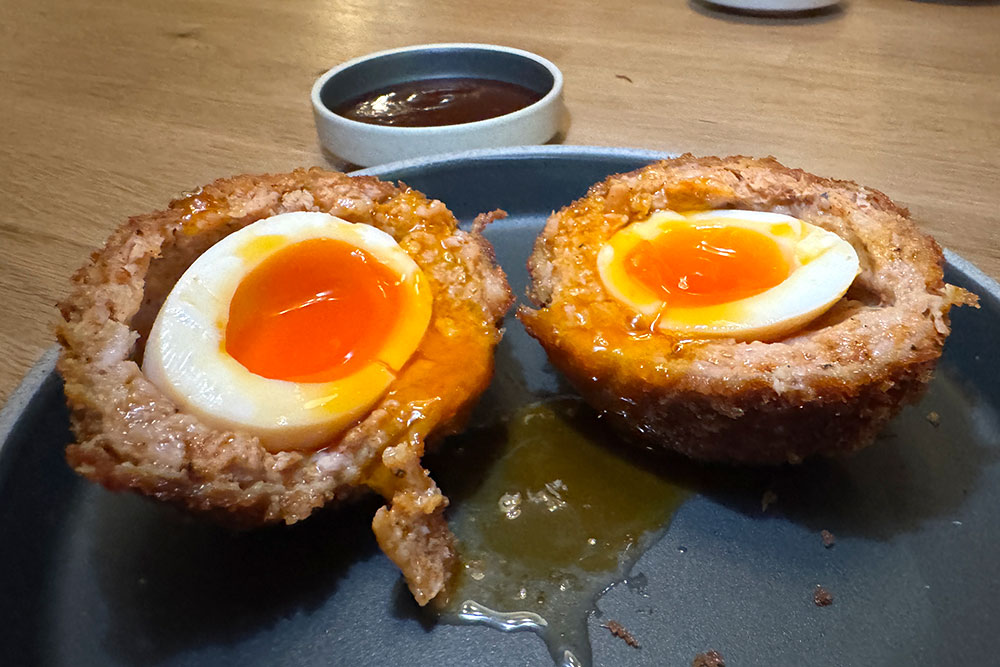 Jerk spiced chicken Scotch egg (£8.50) served with Cochran's famous Scotch bonnet jam. (That ragged cut-through was entirely our fault).