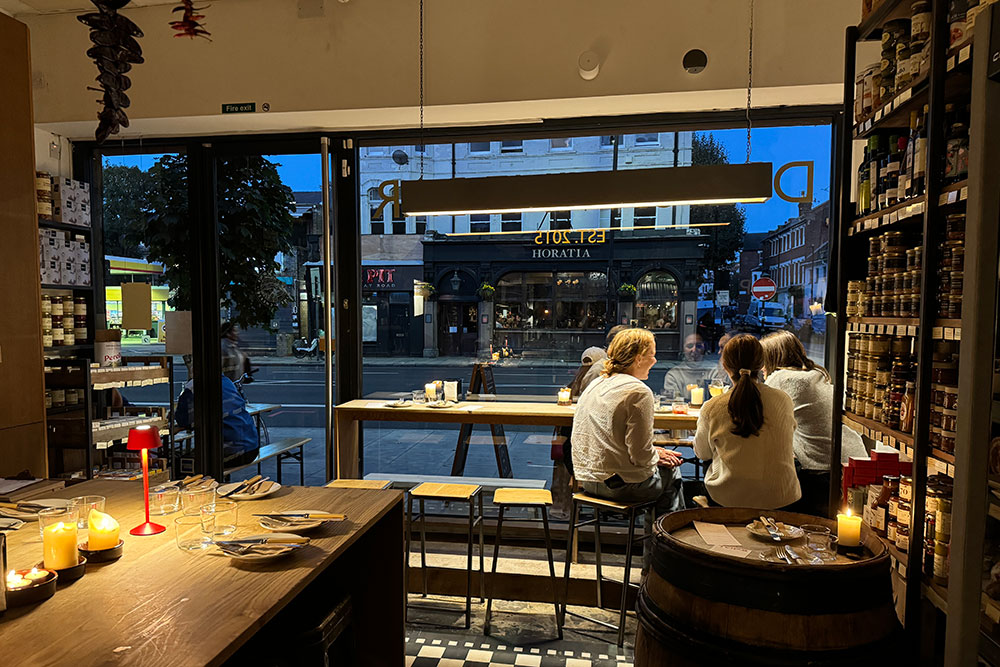 For the residency the shop transforms from its daytime layout, swapping out the central counter, which normally showcases cheeses, for a dining counter. There's even a wine barrel laid out as a table for two. On the night we tipped up the place was pretty much full of folk making merry. All in all, this is a very nice scene.