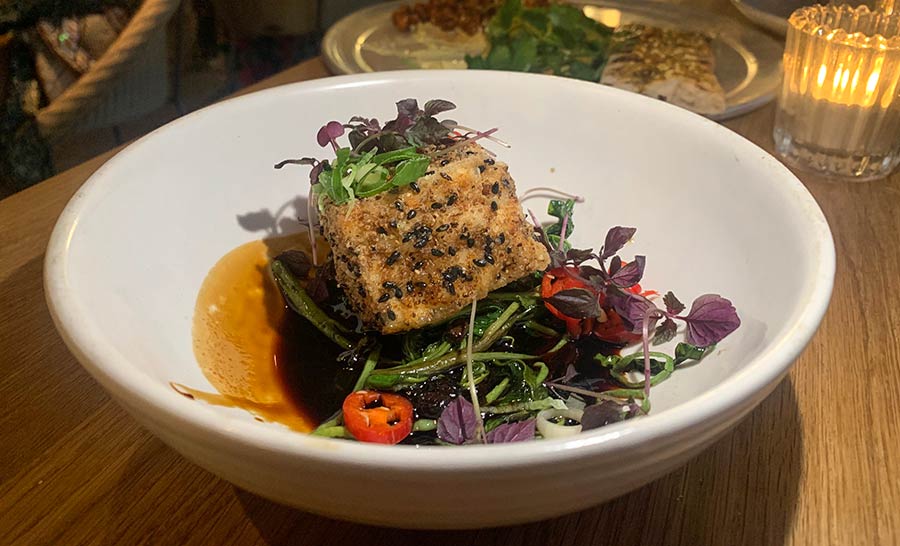 Crispy chilli-salt tofu, ong choi, salted black beans and sesame (£9) - one of the best tofu dishes we've had in an age.