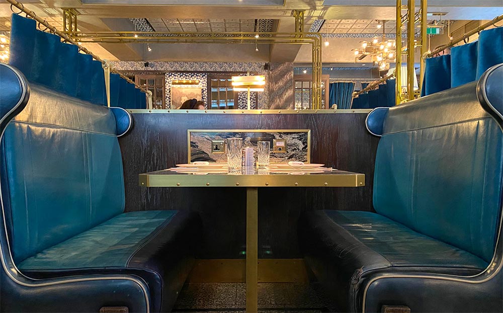 Next - the restaurant with its lavishly appointed booths, complete with the original 'press for Champagne buttons, couldn't be more suited to social distancing - perfect for these current times.